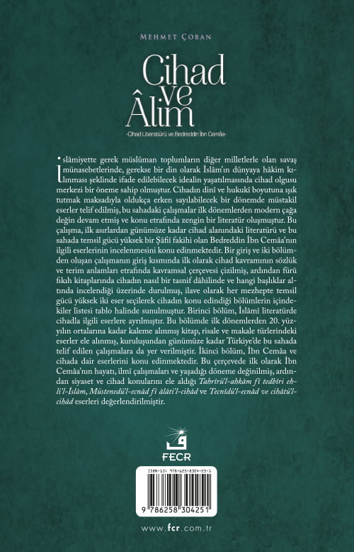 İslâmiyette gerek müslüman toplumların diğer milletlerle olan savaş münasebetlerinde, gerekse bir din olarak İslâm’ın dünyaya hâkim kılınması şeklinde ifade edilebilecek idealin yaşatılmasında cihad olgusu merkezi bir öneme sahip olmuştur. Cihadın dinî ve hukukî boyutuna ışık tutmak maksadıyla oldukça erken sayılabilecek bir dönemde müstakil eserler telif edilmiş, bu sahadaki çalışmalar ilk dönemlerden modem çağa değin devam etmiş ve konu etrafında zengin bir literatür oluşmuştur. Bu çalışma, ilk asırlardan günümüze kadar cihad alanındaki literatürü ve bu sahada temsil gücü yüksek bir Şâfiî fakihi olan Bedreddin İbn Cemâa’nın ilgili eserlerinin incelenmesini konu edinmektedir. Bir giriş ve iki bölümden oluşan çalışmanın giriş kısmında ilk olarak cihad kavramının sözlük ve terim anlamları etrafında kavramsal çerçevesi çizilmiş, ardından fürû fıkıh kitaplarında cihadın nasıl bir tasnif dâhilinde ve hangi başlıklar altında incelendiği üzerinde durulmuş, ilave olarak her mezhepte temsil gücü yüksek iki eser seçilerek cihadın konu edindiği bölümlerin içindekiler listesi tablo halinde sunulmuştur. Birinci bölüm, İslâmî literatürde cihadla ilgili eserlere ayrılmıştır. Bu bölümde ilk dönemlerden 20. yüzyılın ortalarına kadar kaleme alınmış kitap, risale ve makale türlerindeki eserler ele alınmış, kuruluşundan günümüze kadar Türkiye’de bu sahada telif edilen çalışmalara da yer verilmiştir. İkinci bölüm, İbn Cemâa ve cihada dair eserlerini konu edinmektedir. Bu çerçevede ilk olarak İbn Cemâa’nın hayatı, ilmî çalışmaları ve yaşadığı döneme değinilmiş, ardından siyaset ve cihad konularını ele aldığı Tahrîrü’l-ahkâm fî tedbîri eh-li’l-İslâm, Müstenedü’l-ecnâd fî âlâti’l-cihâd ve Tecnîdü’l-ecnâd ve cihâtül-cihâd eserleri değerlendirilmiştir.
