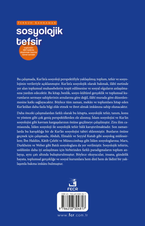 Bu çalışmada, Kur’ân’a sosyoloji perspektifiyle yaklaşılmış; toplum, tefsir ve sosyolojinin verileriyle açıklanmıştır. Kur’ân’a sosyolojik olarak bakmak, İlâhî metinde yer alan toplumsal muhasebelerin tespit edilmesine ve sosyal olguların anlaşılmasına yardım edecektir. Bu kitap, benlik, sosyo-kültürel gerçeklik ve toplumsal kuramların sermaye sahiplerinin arzularına göre değil, ilâhî murada göre düzenlenmesine katkı sağlayacaktır. Böylece tüm zaman, mekân ve toplumlara hitap eden Kur’ân’dan daha fazla bilgi elde etmek ve ibret almak imkânına sahip olunacaktır.